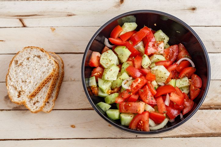 i. Thinly sliced cucumber: 2-3 ii. Chopped tomatoes: 3 iii. Water: 1 cup iv. Apple cider vinegar: ½ cup v. Salt vi. Pepper vii. Olive oil: 1 tsp viii. Onion, thinly sliced(optional): ½ cup